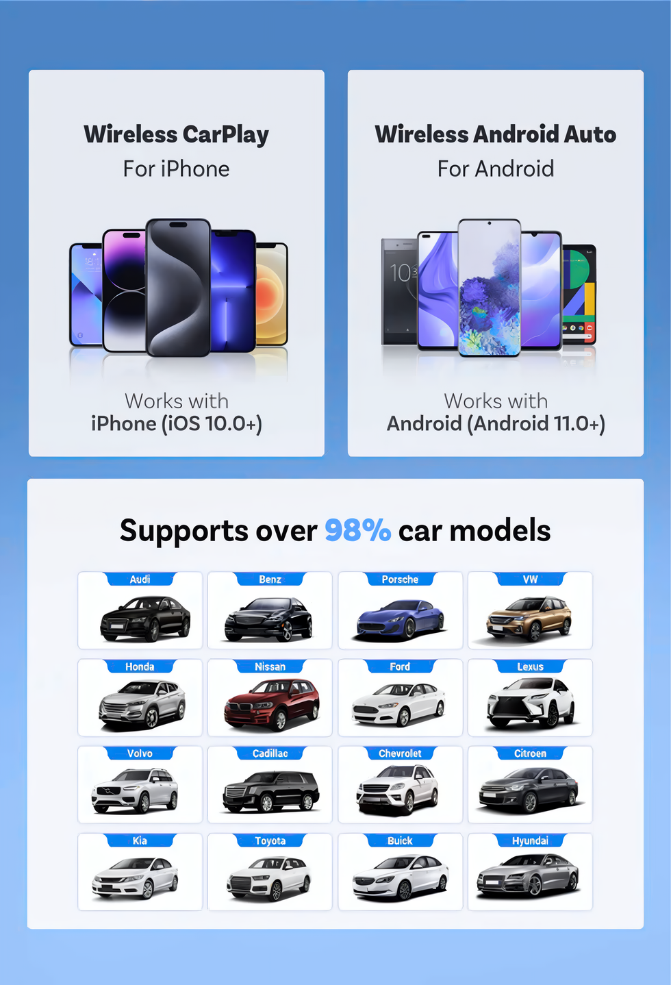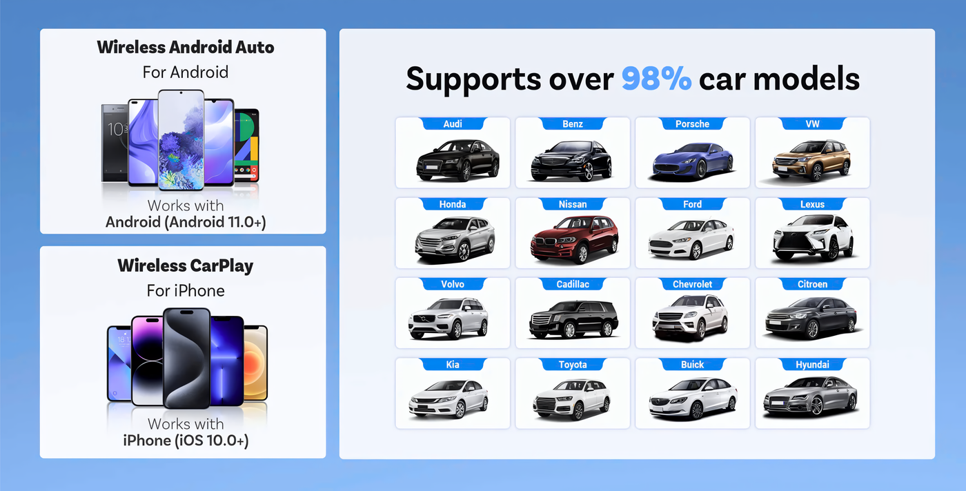 Upgrade to Wireless Freedom: Effortlessly convert your stock wired CarPlay or AA into a wireless experience. Compatible with over 600 car models equipped with OEM wired CarPlay/AA (NOT compatible with BMW, Audi, Mazda, or Benz).