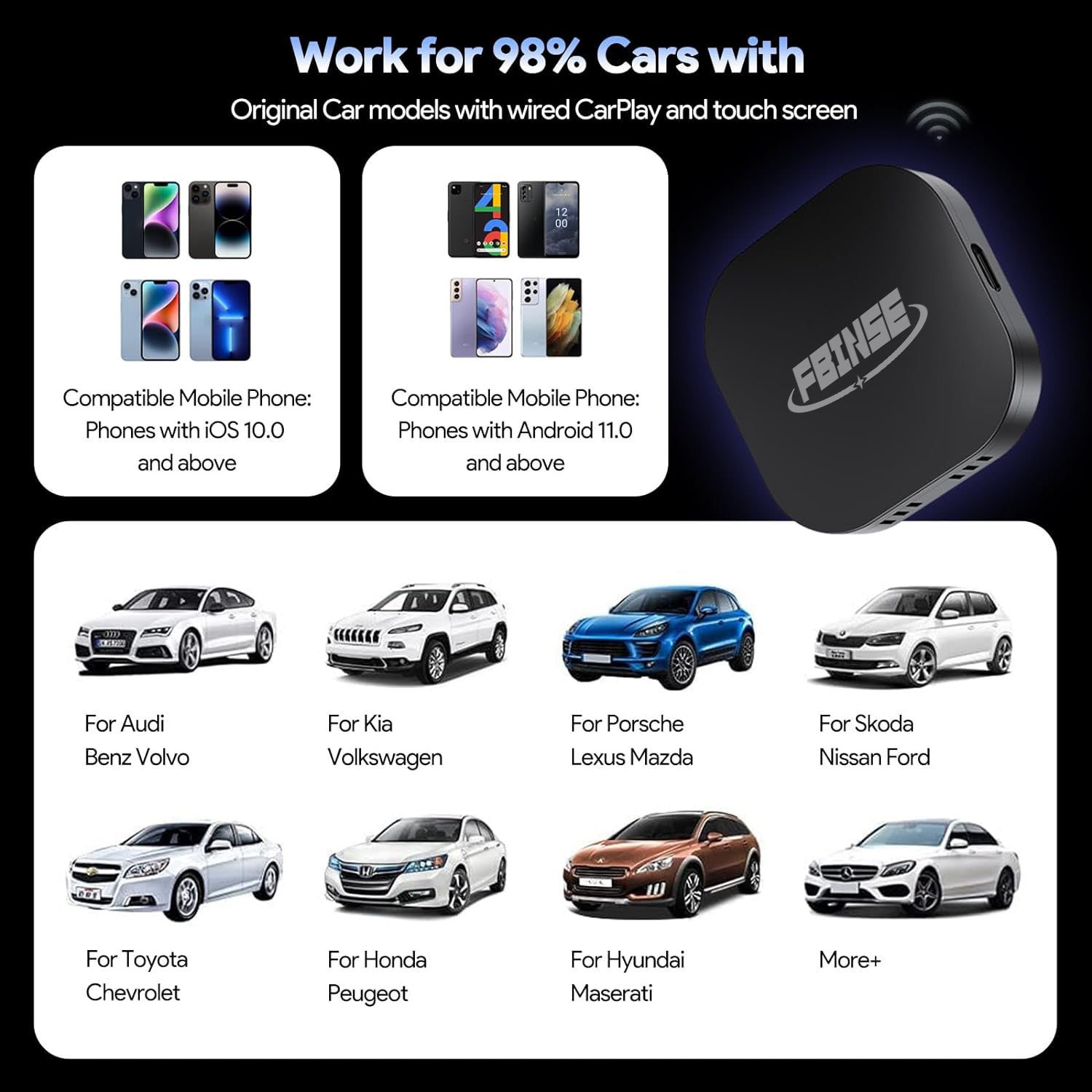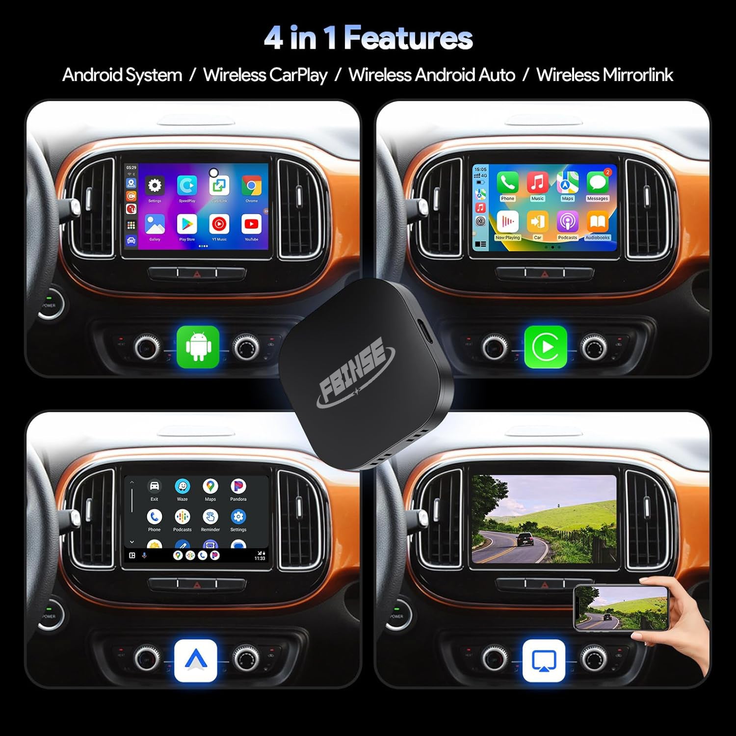 🎊【With Android system 4-in-1 CarPlay Box】This CarPlay Ai box is Compatible with built-in OEM wired CarPlay/Android Auto car stereo. No more wired connections; you can now smoothly use wireless CarPlay and Android Auto. It completely reduces the wear and tear on your phone caused by frequent plugging and unplugging of charging cables, replacing the need for complicated data cables and expensive car systems. It transforms your vehicle into a cutting-edge entertainment hub.