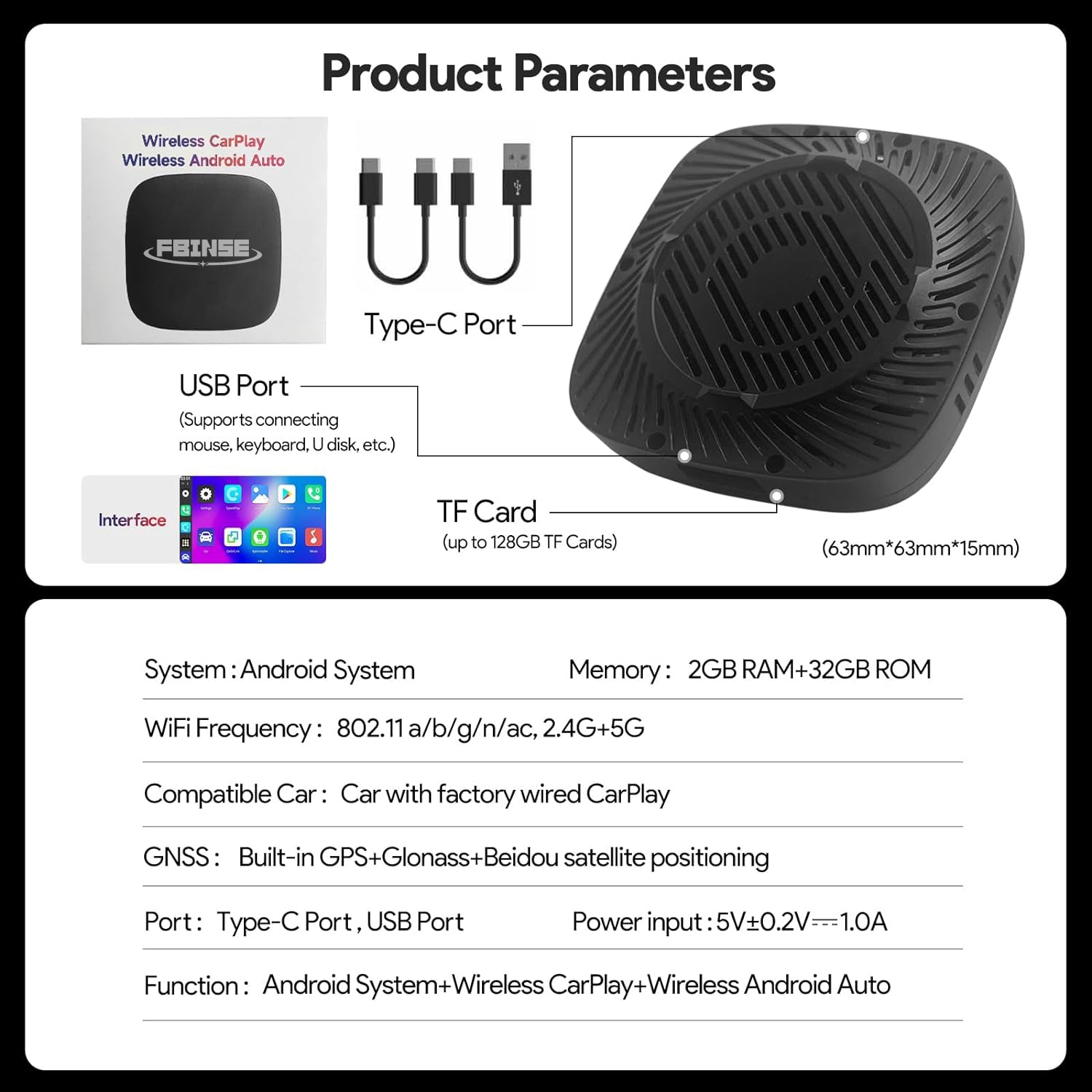 🎊【Wireless CarPlay Android System】With this box, you can convert your existing wired CarPlay system to wireless without hassle. Enjoy all the features of CarPlay such as navigation, music playback, Siri, and phone calls, without wired connections.