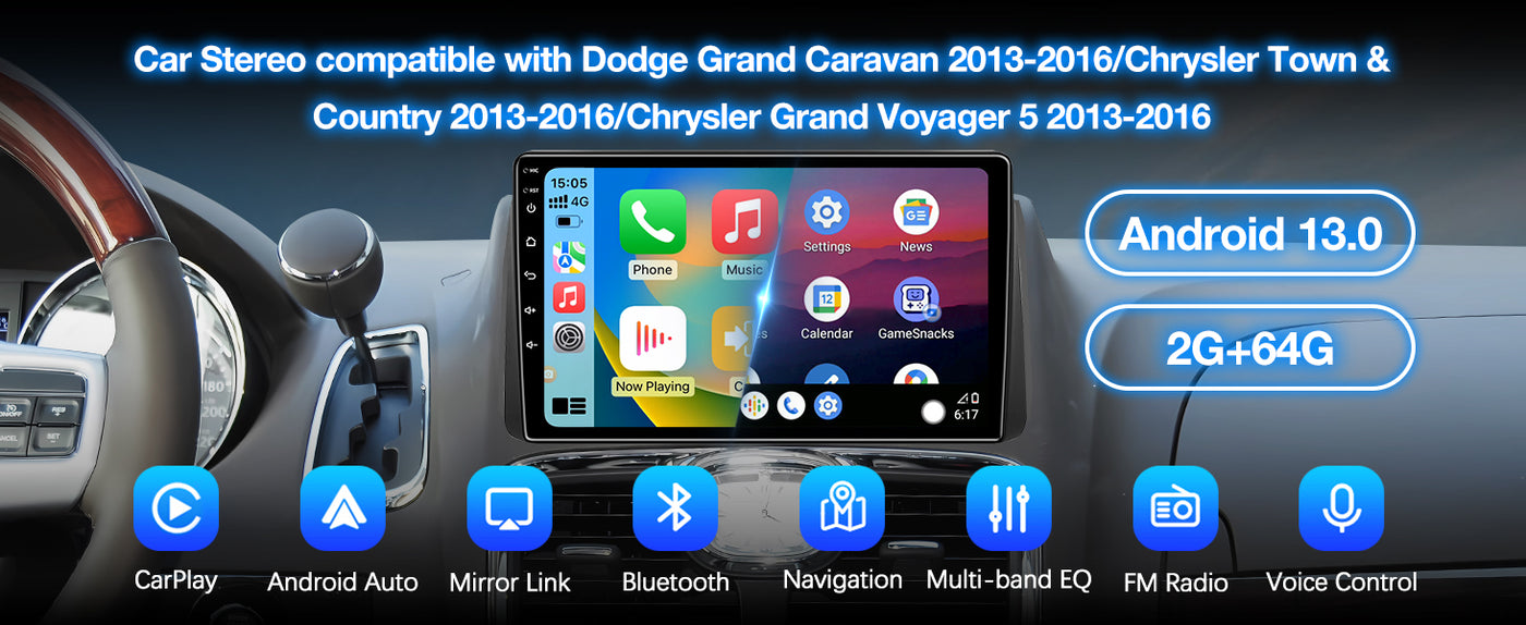 Experience the latest Android 13 System with 2GB RAM and 64GB ROM for ample storage. Enjoy stunning visuals on the 9-inch QLED touchscreen. Fast Bluetooth connectivity with built-in and external microphones ensures hands-free calls and music control. Perfectly compatible with Dodge Grand Caravan (2013-2016) and Chrysler Town & Country (2013-2016).