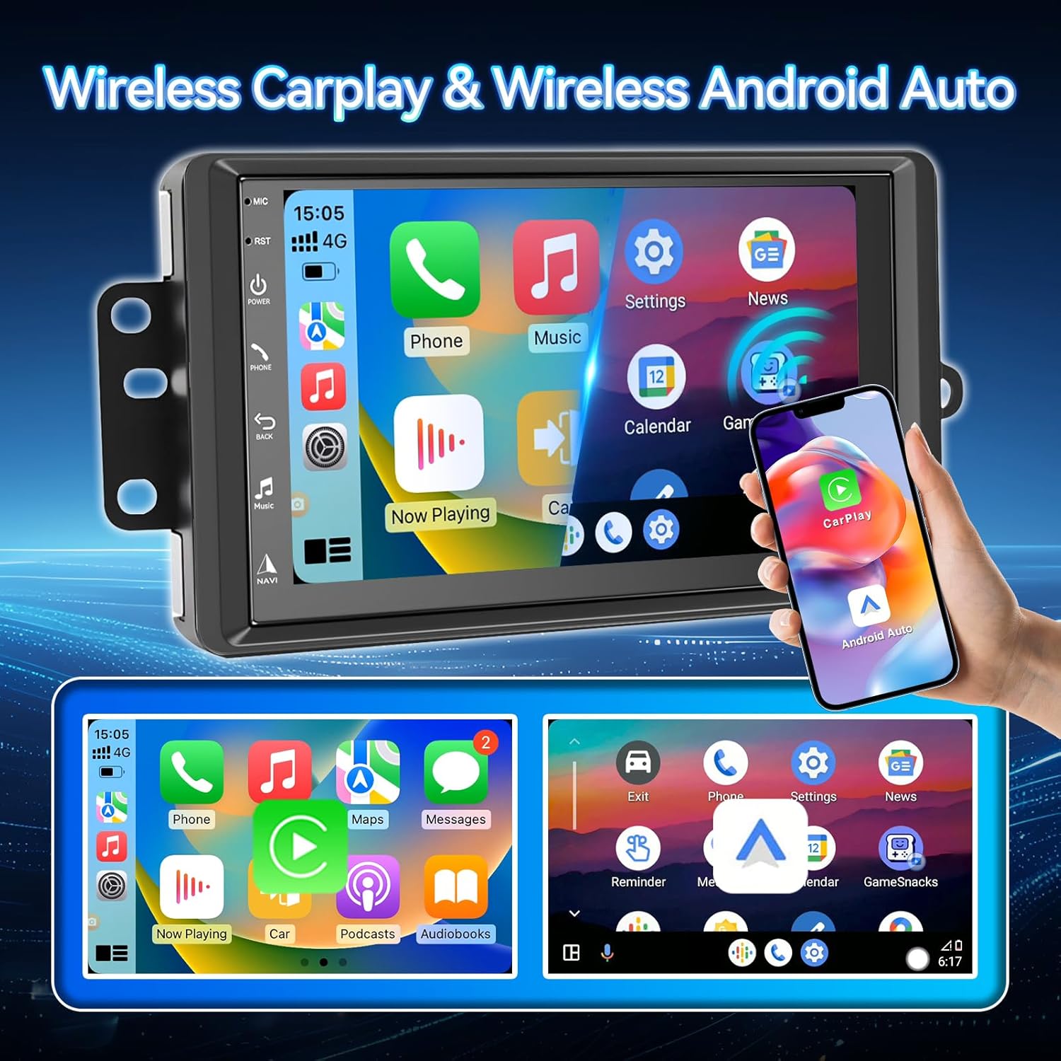 Seamlessly connect your iPhone or Android device via Bluetooth to access wireless CarPlay and Android Auto. Enjoy hands-free navigation, calls, messaging, and music with voice control—no cables needed.