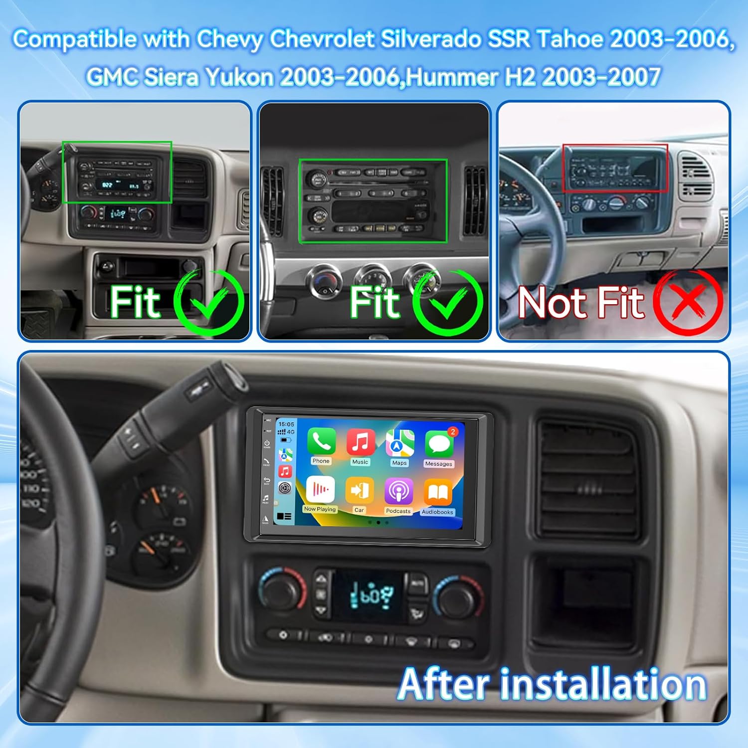 Car Stereo for Chevy/GMC/Humme/Chevy Silverado/Tahoe 2003–2006, GMC Sierra/Yukon & Hummer H2 2003–2007 with Wireless CarPlay & Android Auto, GPS, Backup Camera, HiFi Audio, SWC