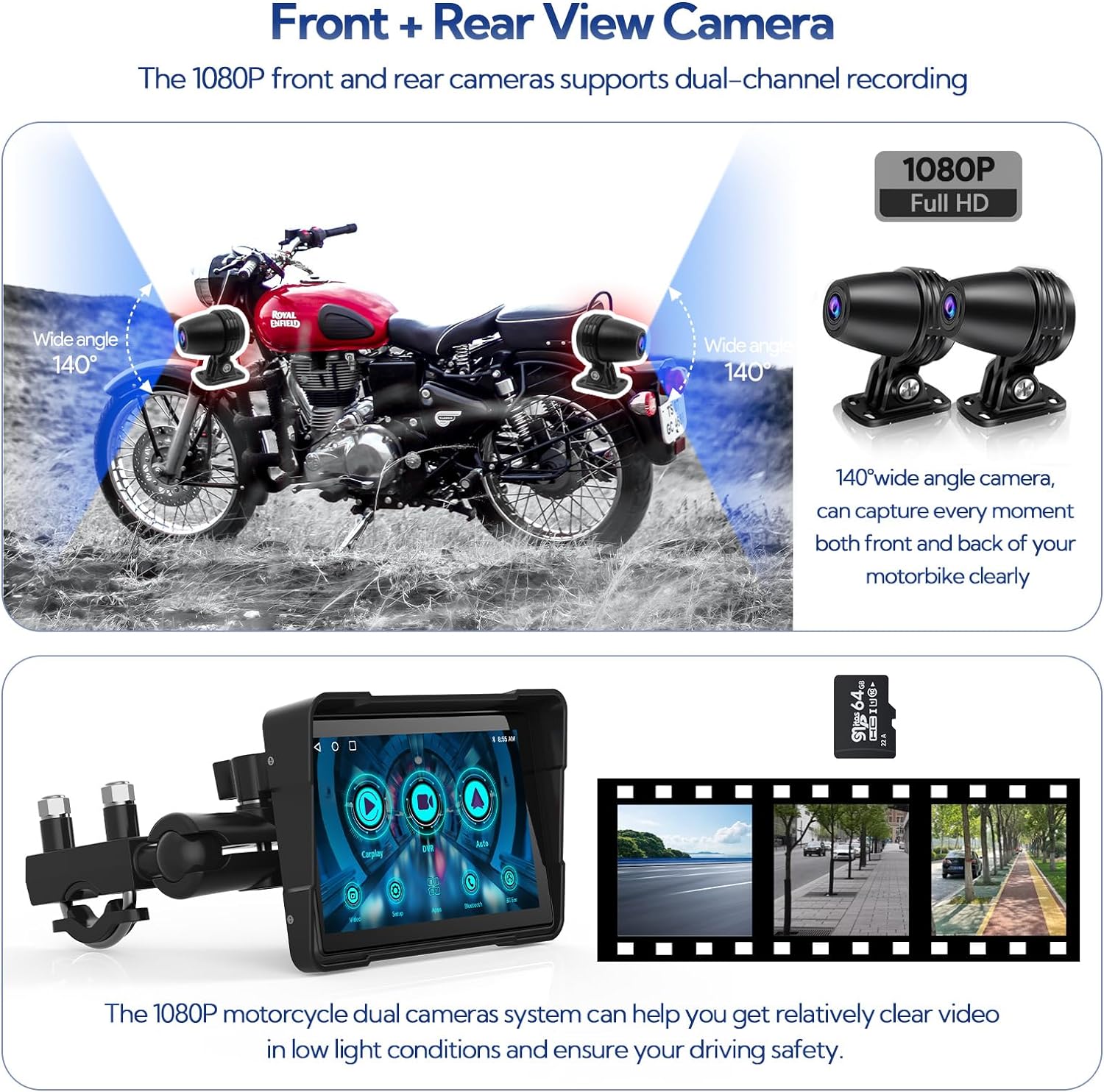 🏍【Motorcycle DVR, 5 Inch HD Touch Screen】This screen has 1080P front and rear dual cameras and supports dual-channel recording. Built-in 64GB TF card facilitates your recording. 140-160 degree wide-angle display. It has a peak brightness of 1000nit, so you can see even in the sun. 800x480 resolution, 65K RGB color display. Support screen mirroring function.
