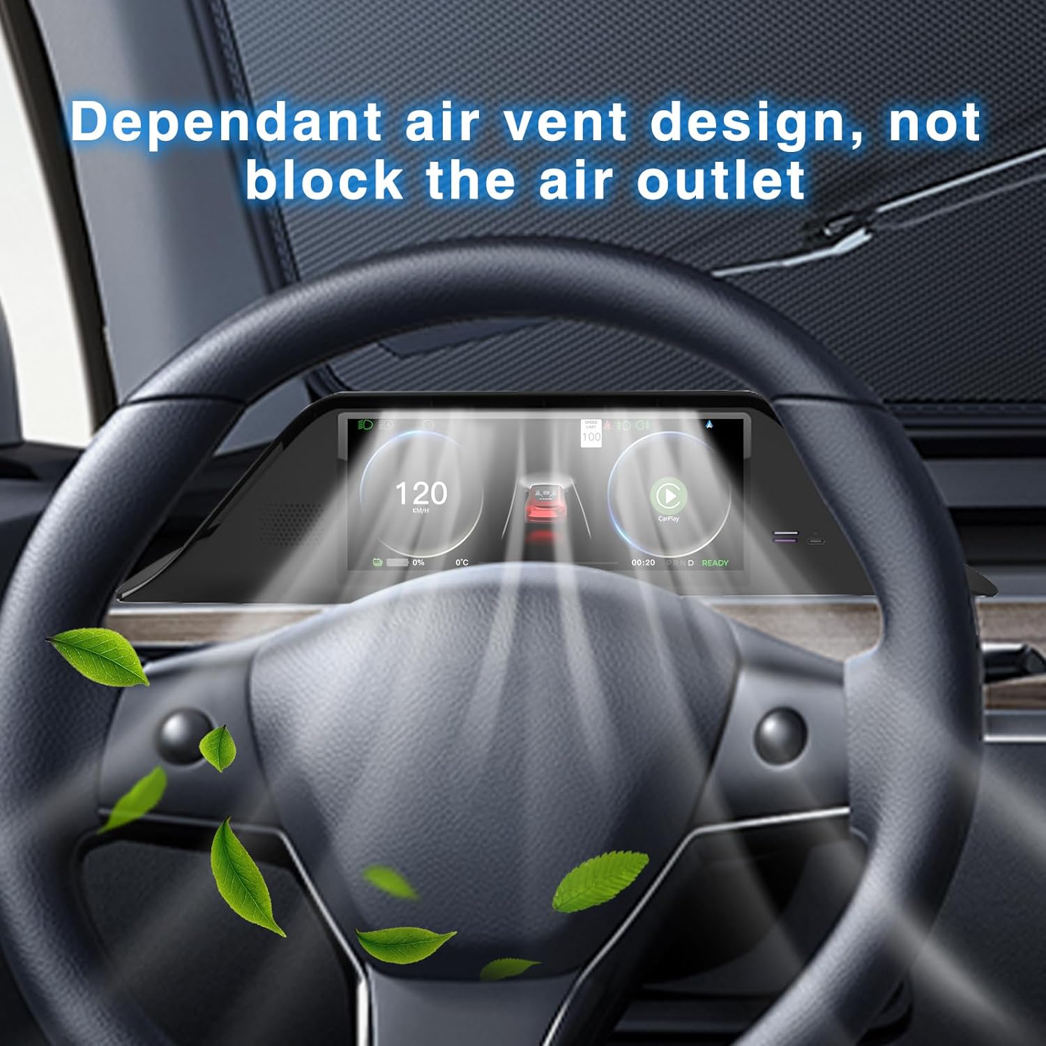 The HUD features an independent air vent on the dashboard, allowing for uninterrupted airflow to keep you comfortable. Its placement ensures that the heads-up display doesn’t block any air circulation, making driving safer and more comfortable without distractions.